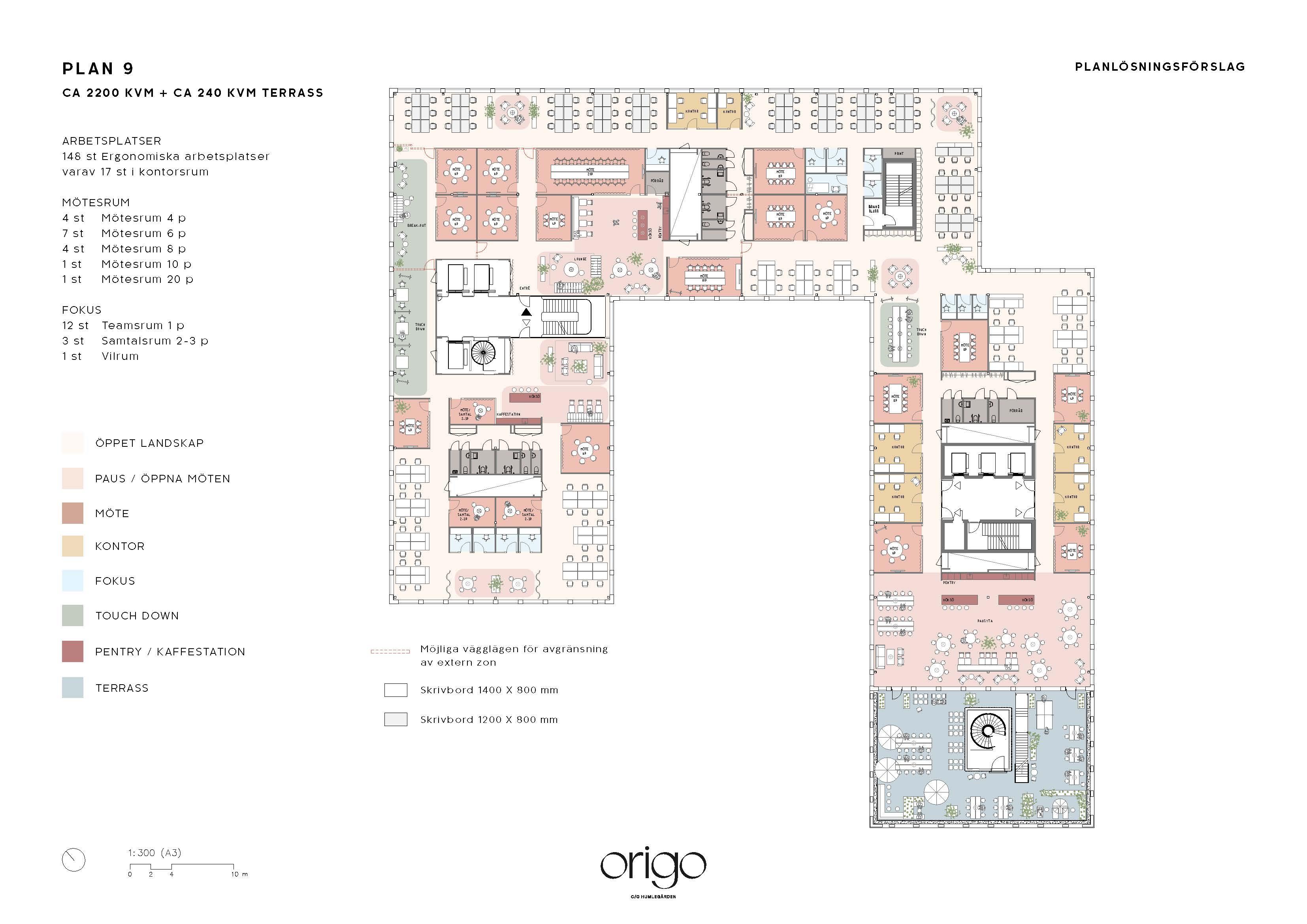 9 våningar upp i Origo finns en unik lokal med egen takterrass och utsikt i fyra väderstreck. Här har ni även nära till husets gemensamma takterrass om 400 kvm med orangeri och utebar. Lokalen har stora generösa fönster och god takhöjd med 2,70 till undertak. Det ligger installationsgolv vilket tillåter stor frihet i möbleringen. Kontorsytorna är såväl flexibla som ytsmarta och kan hantera ner till 1 person/10kvm. Huset är energieffektivt och har närvarostyrda ventilations- och belysningssystem. Husets designval av mattor, pentry och mötesrumspartier är hållbara och medvetna materialval. De har en skandinavisk neutral kulörpalett vilket harmoniserar med huset och ger stor frihet till att sätta accentfärger med egna möbler och textilier. Bifogad planlösning är ett förslag på utformning. När vi vet mer om era behov och önskemål justerar vi lokalen utifrån dem. Utöver egna lokaler har ni tillgång till husets alla faciliteter så som gemensamma ytor för möten och sociala sammankomster, konferensytor, reception, café, bar, restaurang, takterrasser, gym, duschar och omklädningsrum.