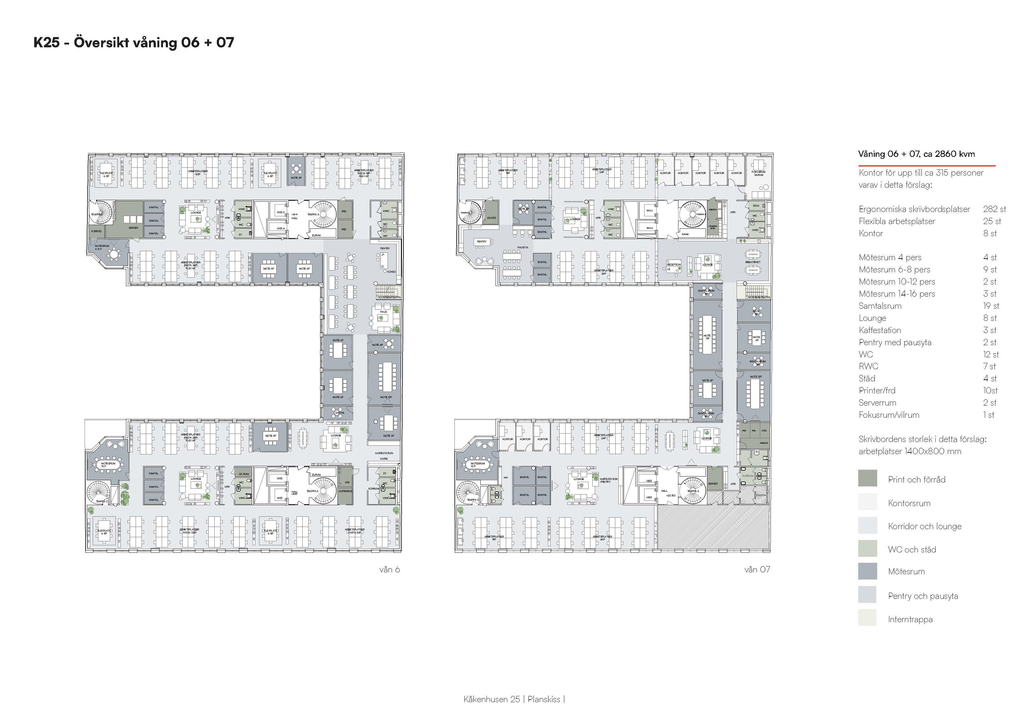 Hyr våning 6 och 7 och skapa ett drömkontor om 2 860 kvm med plats för cirka 315 personer. En generös interntrappa binder samman de två planen till en naturlig helhet. Planlösningen kombinerar öppna ytor med fasta och flexibla arbetsplatser, stängda kontorsrum samt mötesrum i olika storlekar. Här finns också gott om pausytor för gemenskap och spontana samtal. Kontorets hjärta finns på plan 6, ett öppet pentry med köksö och lounge.