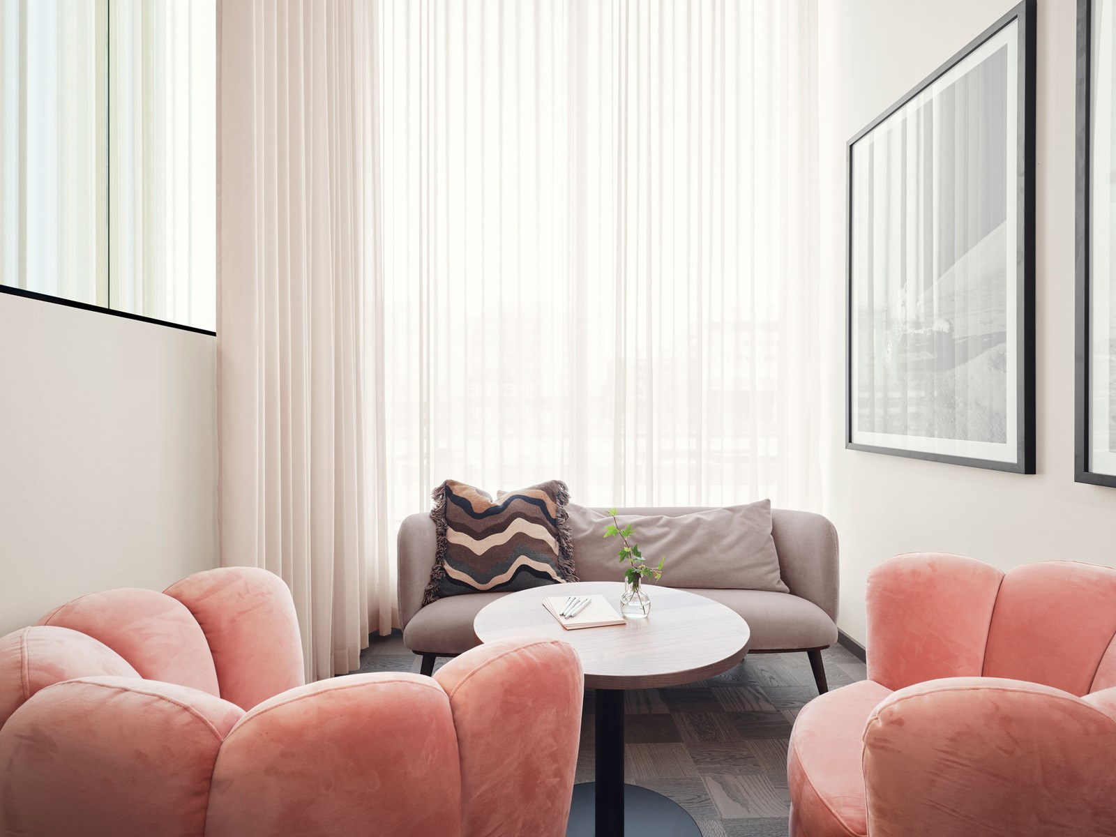 Välkommen till ett rum där samtalet står i fokus. Här erbjuds en ombonad miljö med bekväma fåtöljer och ett härligt ljusinsläpp.
