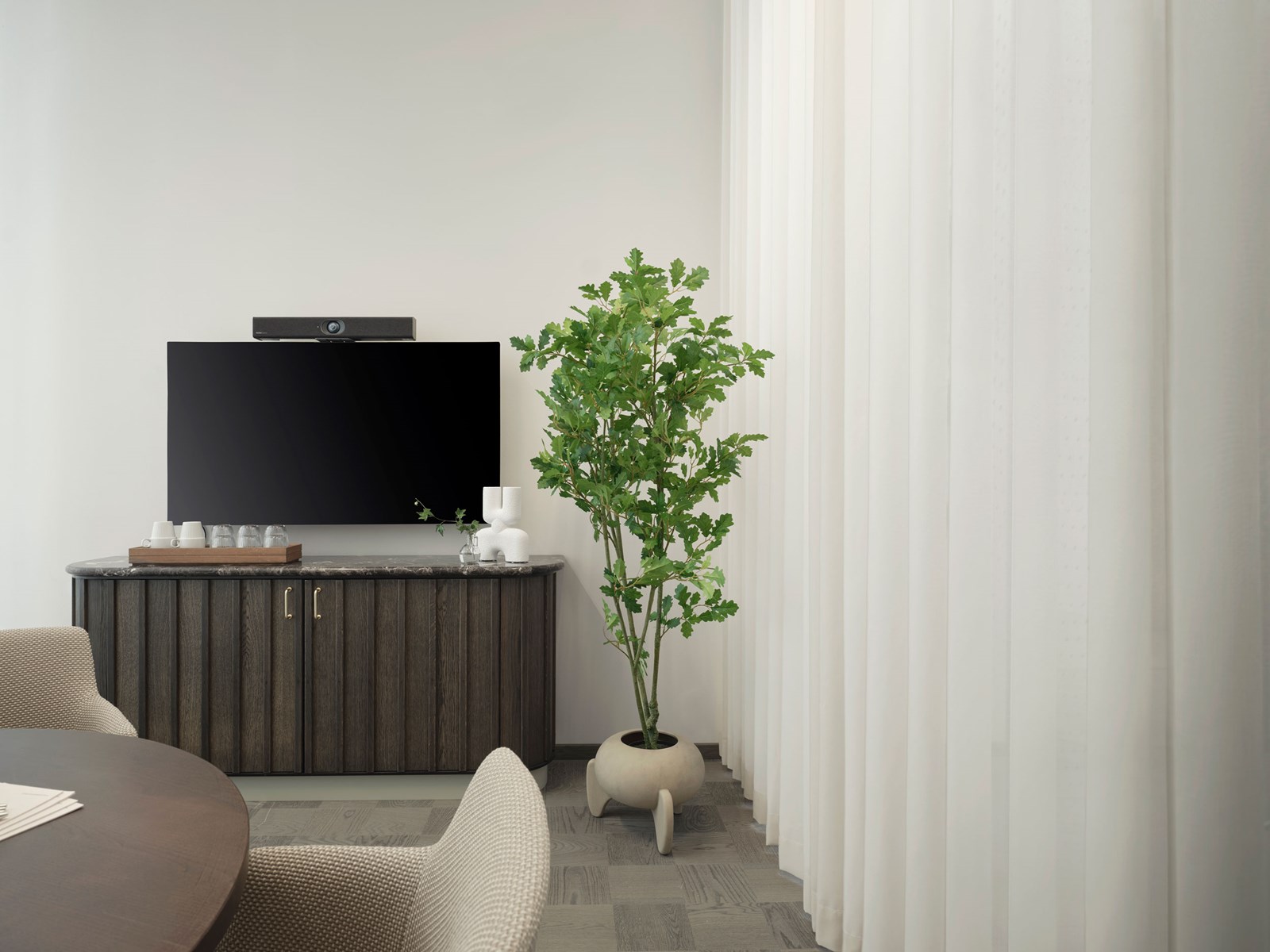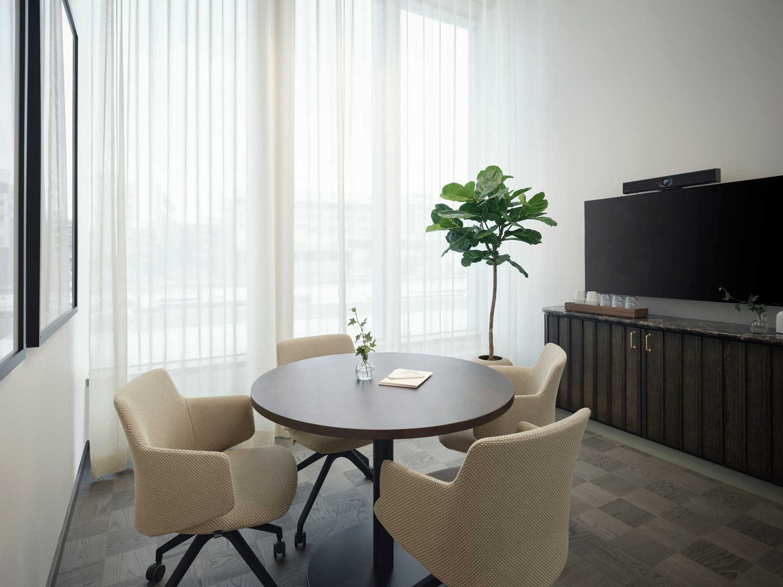 Välutrustat mötesrum med en inbjudande inredning i sobra färger.