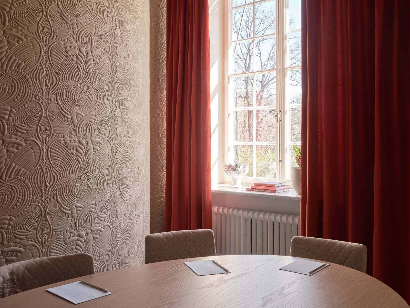 Ett rum med intim atmosfär och rund sittgrupp – perfekt för samtal eller intervjuer.