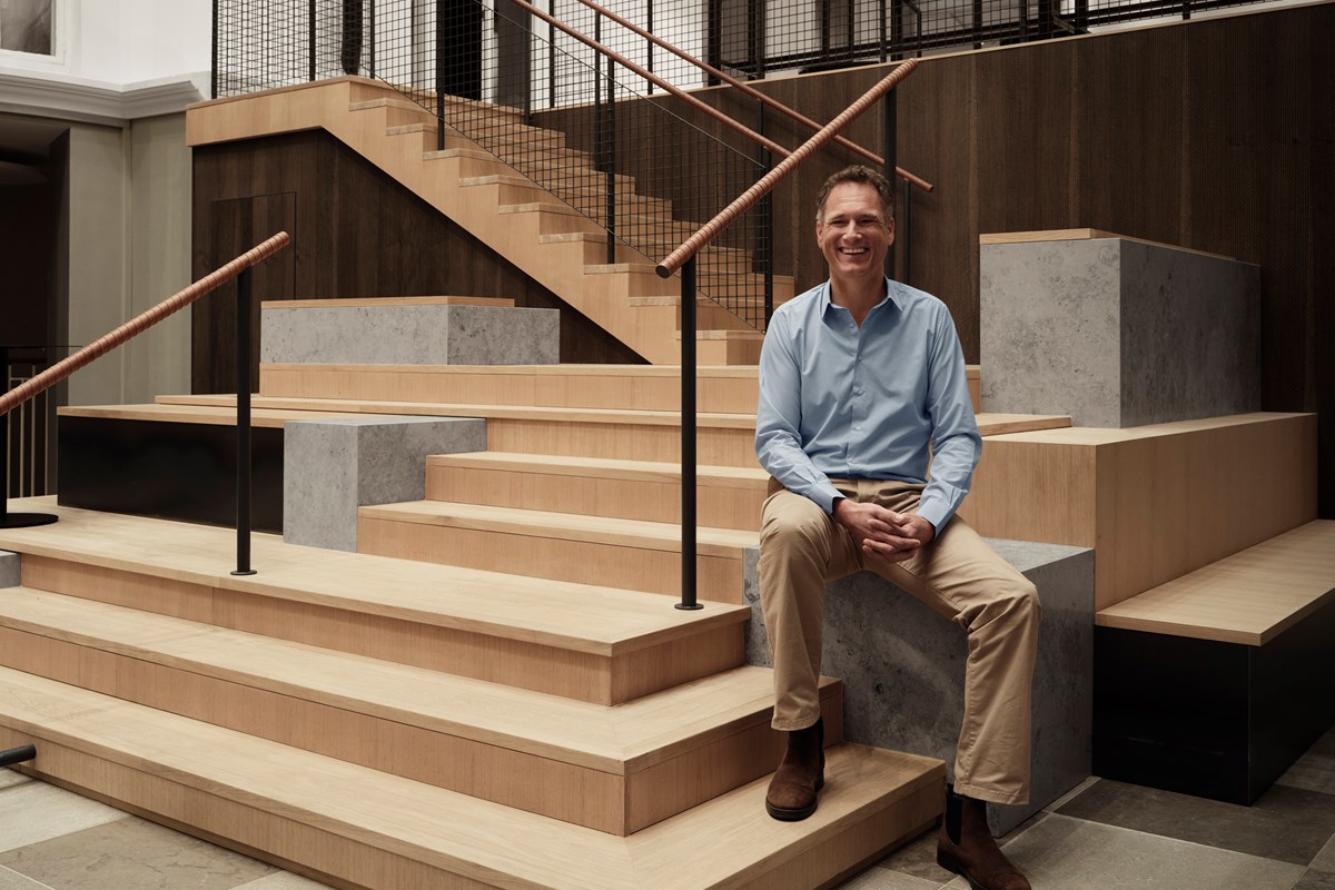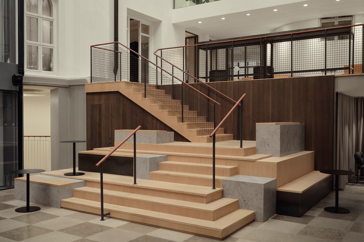 Den största klimatbesparingen i projektet kommer från alla byggdelar och material som rekonditionerades eller förblev orörda. Det gamla ekgolvet samt en befintlig trappa i lokalen har till exempel bevarats, byggts om och används som stomme i ny gradäng, medan en del av glaspartierna och armaturerna har återbrukats – vilket innebar att delar av undertaket också kunde sparas. Vi har också återanvänt material från andra byggprojekt, samtidigt som en del material som inte kunde återbrukas i Brunswicks lokaler har använts i andra projekt.