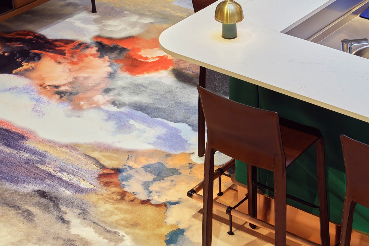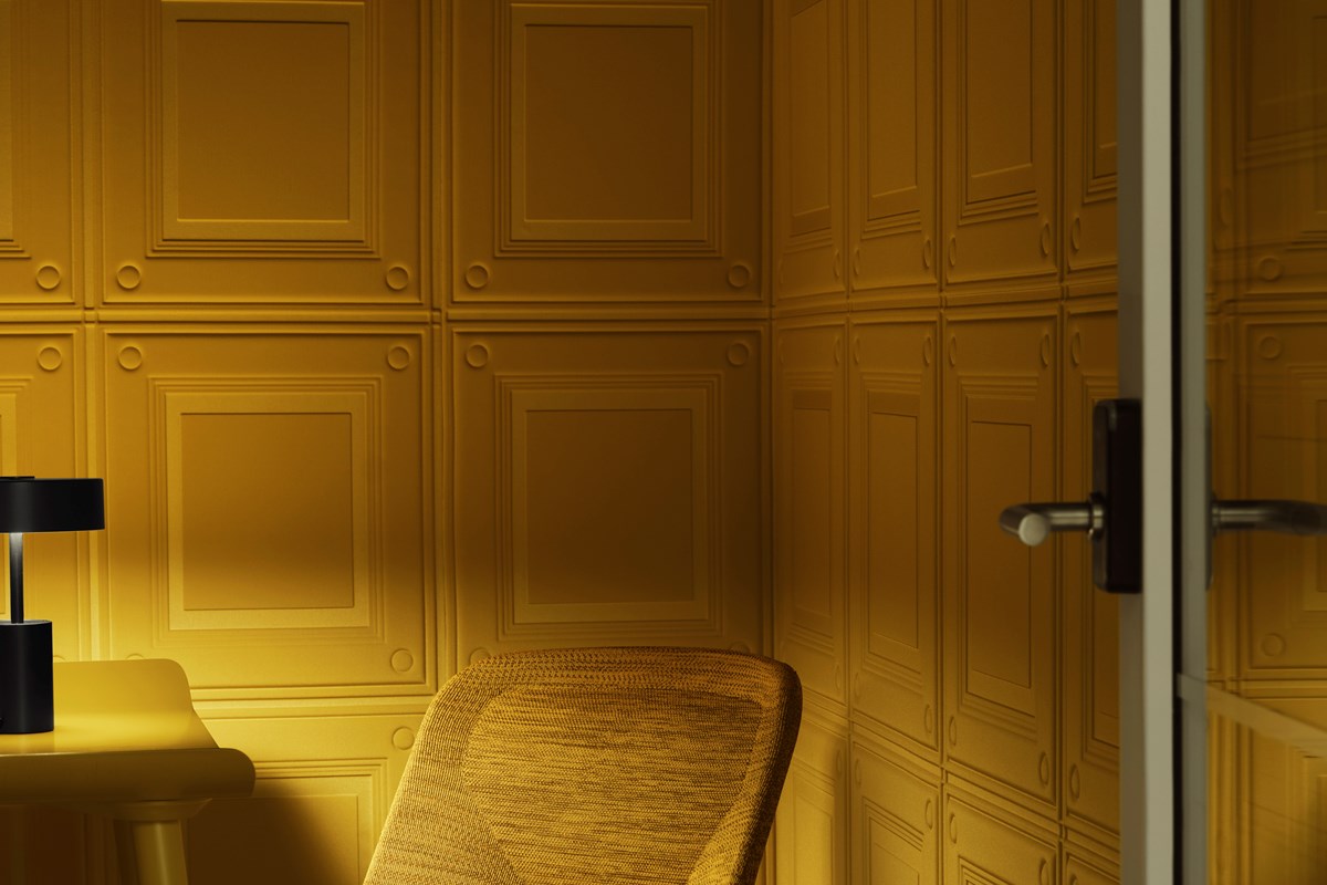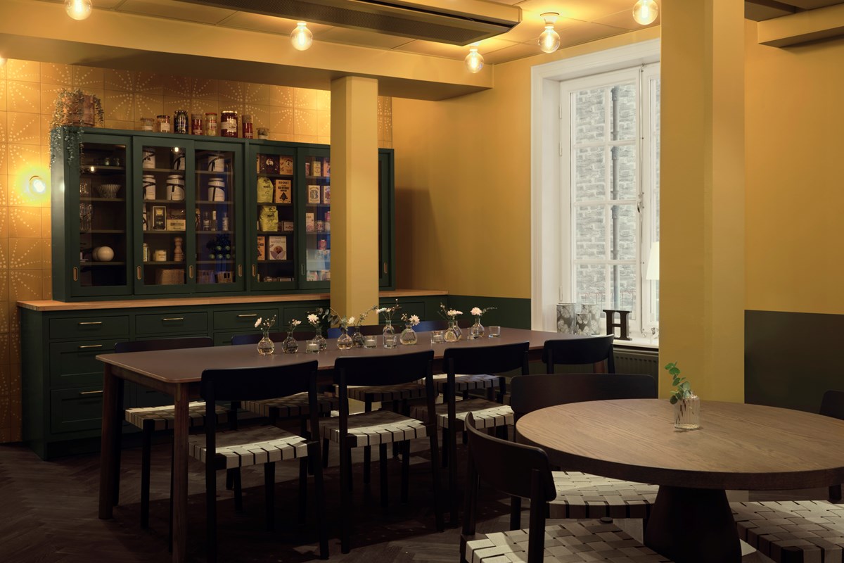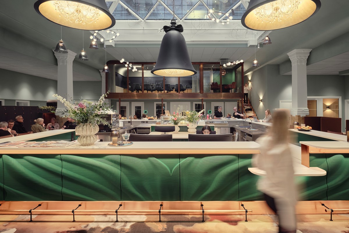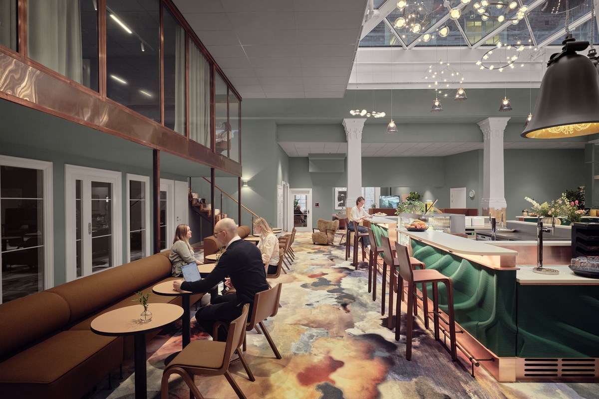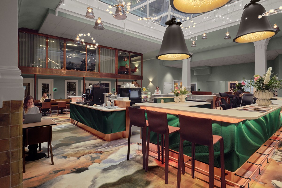 Konceptet som ligger till grund för upplevelsen tar avstamp i idén om att resa och upptäcka nya miljöer. För inredningen står Monica Eskedahl, konceptdesigner och inredare, i samarbete med Humlegården. Både medarbetare och besökare bjuds på en variation av tempo och upplevelser för alla sinnen i en variationsrik och flexibel miljö. Energifyllda och stimulerande miljöer kombineras med rum där man kan ladda batterierna och få nya insikter och inspiration. Hjärtat i lokalen är den gemensamma yta som också möter alla besökare och även är tillgänglig för de övriga hyresgästerna i huset, där en reception kombineras med välkomnande lounge- och arbetsytor. Platsen kan användas för större sammankomster och har utrustats med modern teknik för möten och musik. Mittpunkten i rummet utgörs av en skulptural 3D-printad bardisk som fyller många funktioner. Den har formgivits av designstudion Interesting Times Gang och är baserad på återvunna fiskenät och träspill. Glastaket smyckas av armaturer i en skräddarsydd konstinstallation som för tankarna till stjärnhimlen. I kombination med byggnadens vackra arkitektur skapas en arbets- och mötesplats utöver det vanliga.