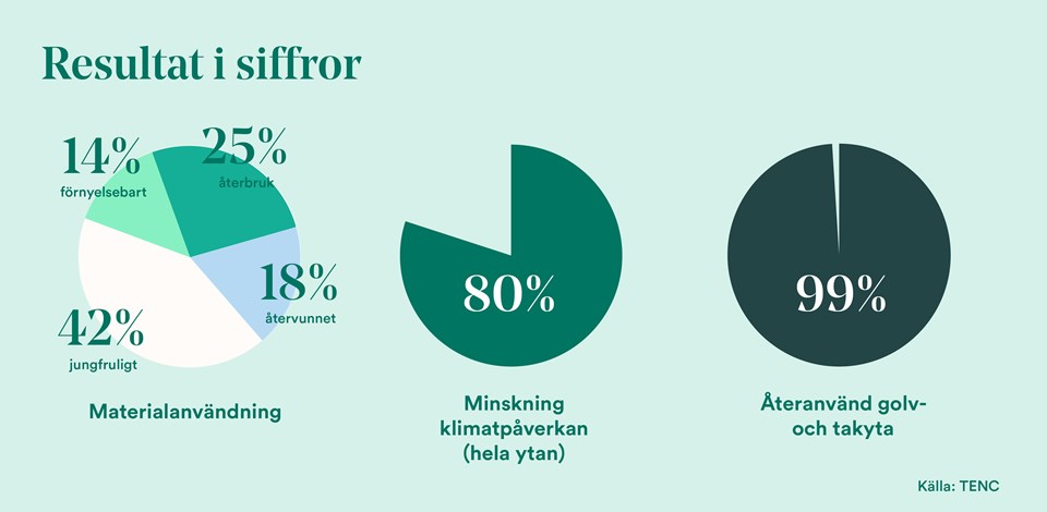 I arbetet med lokalerna minskade klimatpåverkan för hela kontorsytan med 80 procent jämfört med en traditionell ombyggnation – främst genom att behålla planlösningen. Hela 99 procent av golv- och takytan bevarades. Där renovering behövdes minskade vi klimatpåverkan med 40 procent genom återbruk av material.
