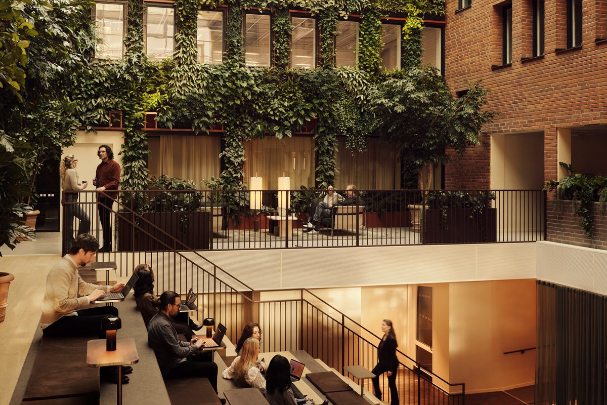 En trappa ned finns en restaurang och på taket en grönskande terrass under bar himmel.