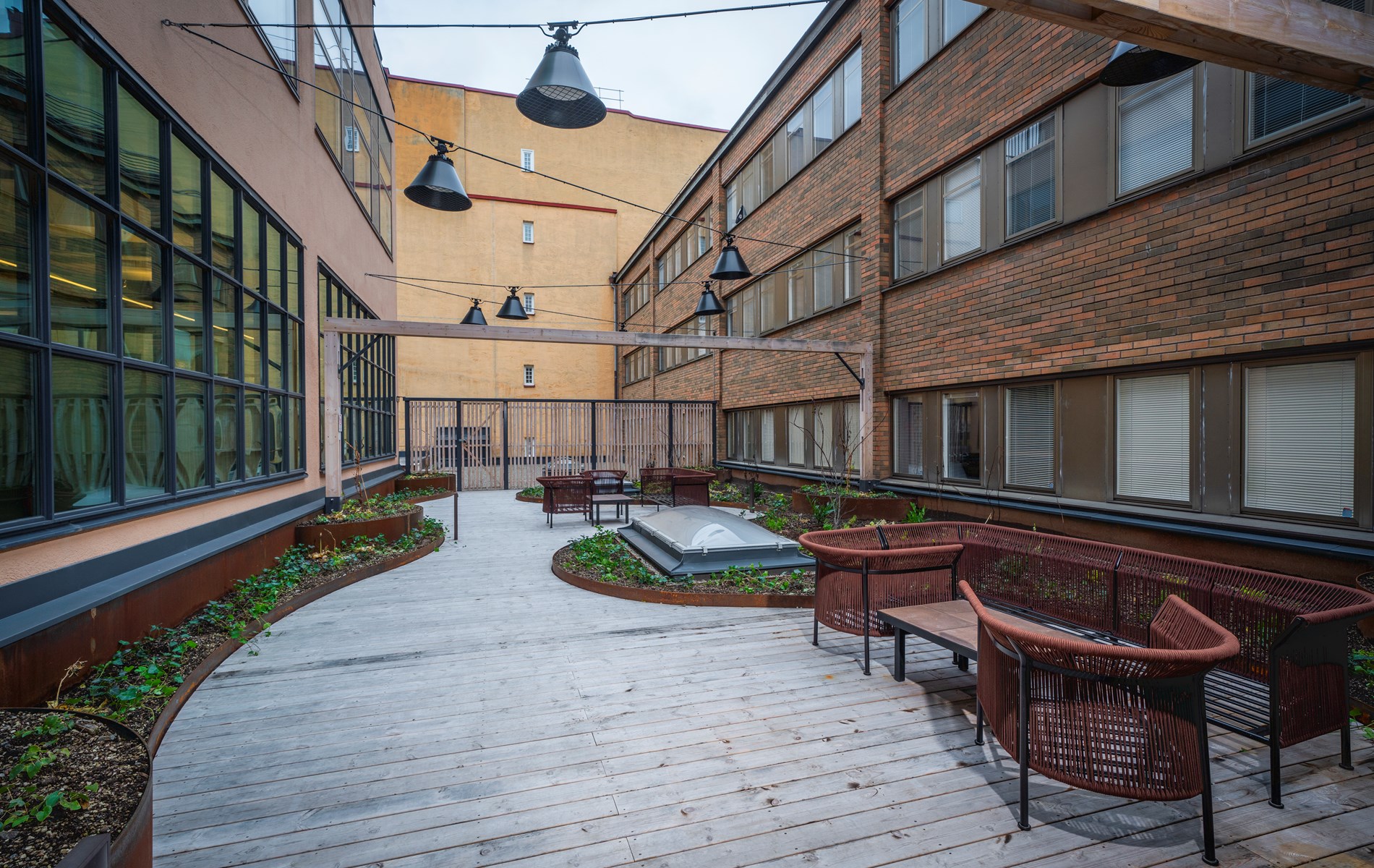 De gamla industrilokalerna har varsamt omvandlats till inbjudande och moderna kontorslokaler. Stora ytor och höga fönster med generösa ljusinsläpp ger en ljus och öppen atmosfär.